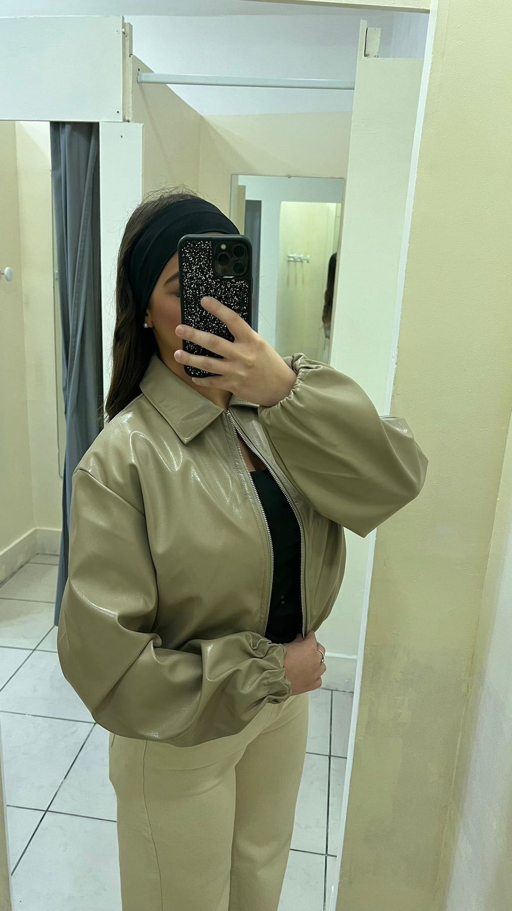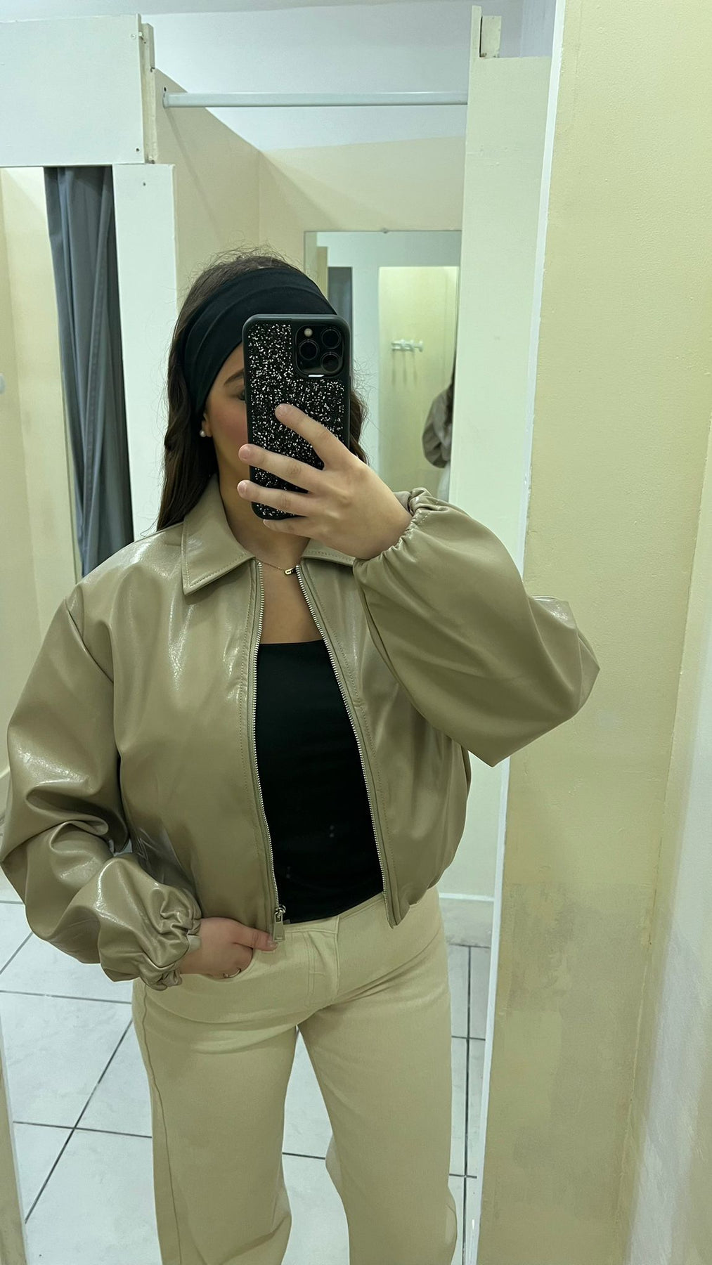 Veste Courte En Cuir Taupe
