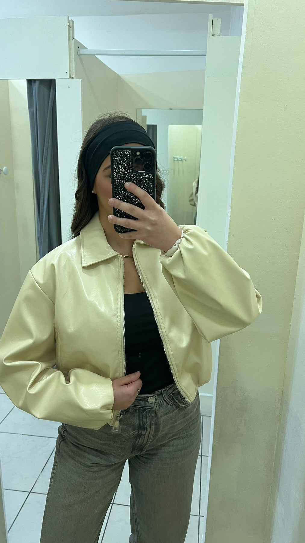 Veste Courte en Cuir Beige